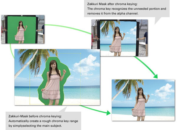 ROBUSKEY for Video is plug-in for Adobe After Effects, Adobe Premiere Pro, Apple Final Cut Pro and Grass Valley EDIUS. The plug-in was created in response to requests from creative professionals for a tool that would make it easier to cut out a background and create more visually appealing composites. Matting is possible even if the video is shot under non-ideal conditions, such as weak lighting, wrinkles or shadows on the background, or too small of a background. Matting work and time are cut considerably. The plug-in can be used not only when editing the video but also when actually shooting it.